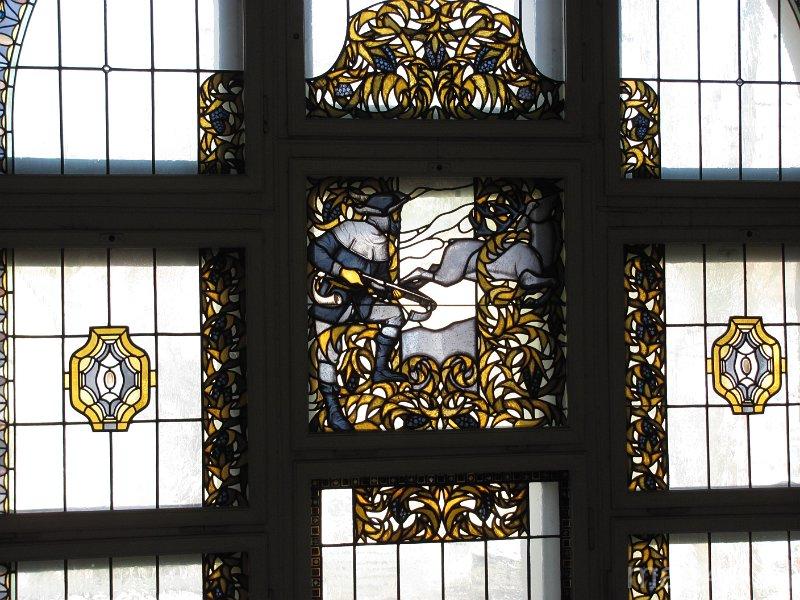 We wnętrzach zachował się oryginalny witraż przedstawiający scenę polowania.