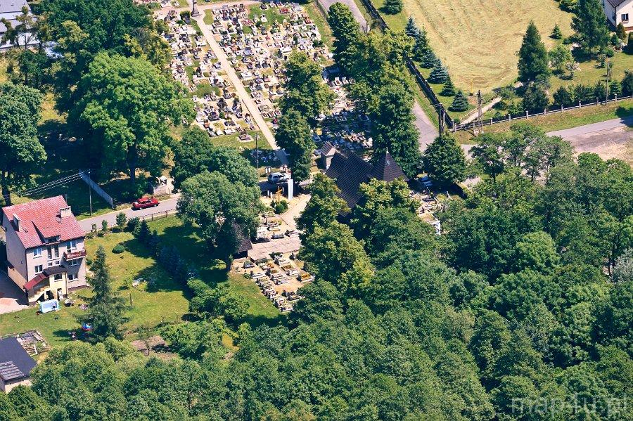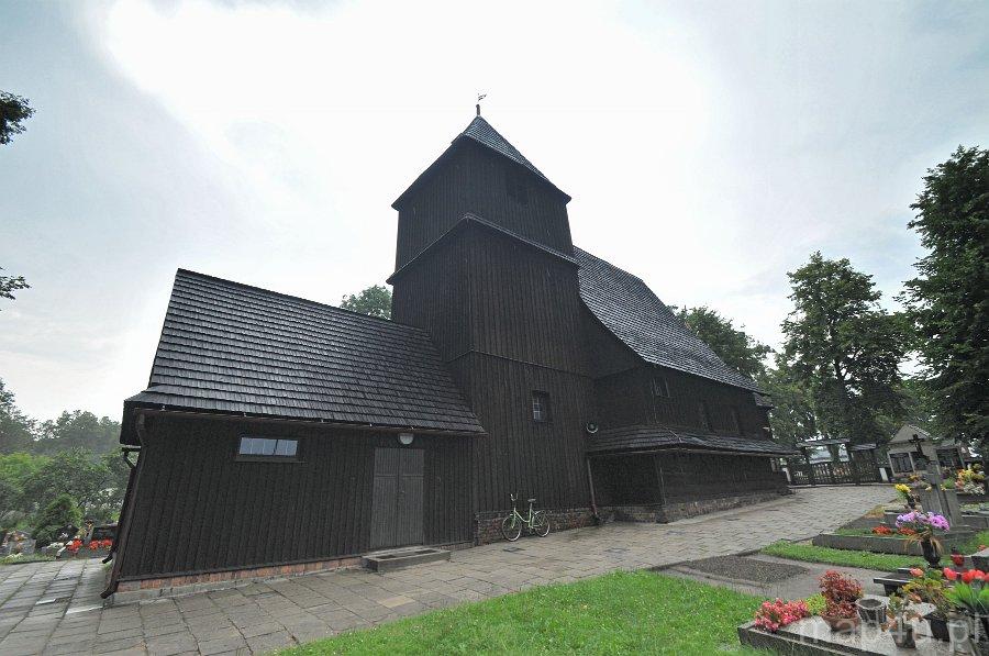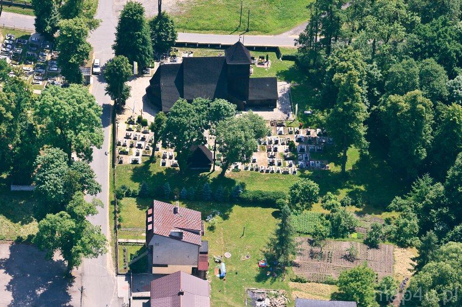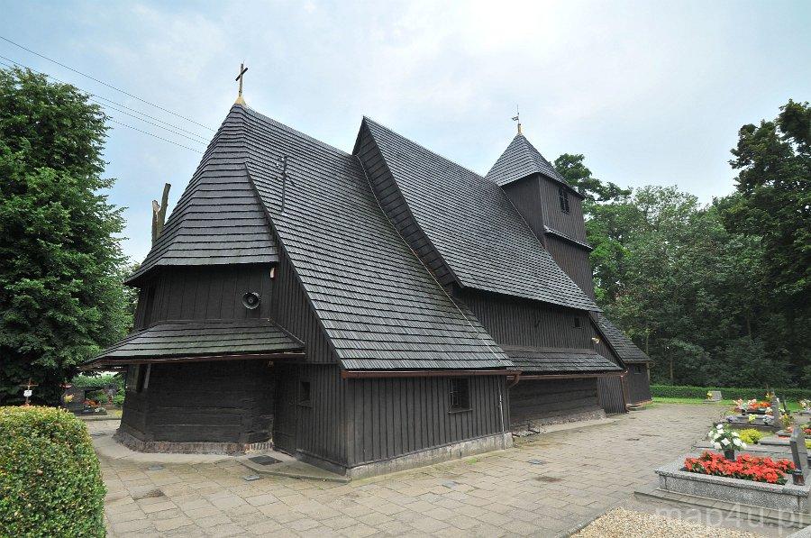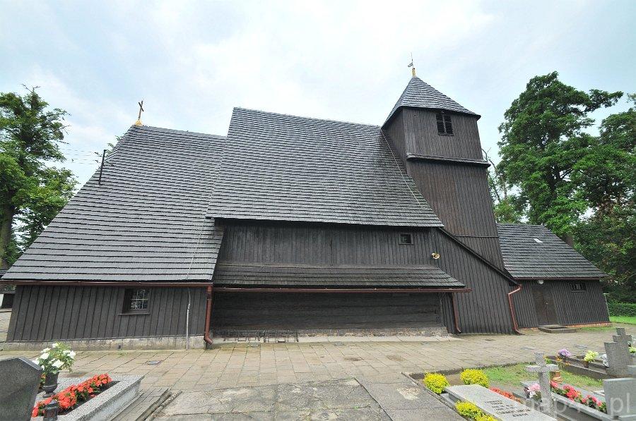Kościół jest orientowany, drewniany na ceglanej podmurówce, o konstrukcji zrębowej z wieżą – dzwonnicą o konstrukcji słupowej. Nawa została wzniesiona na rzucie zbliżonym do kwadratu. Zamknięte trójbocznie prostokątne prezbiterium, skierowane w kierunku wschodnim, jest węższe od nawy. Od strony północnej przylega do niego również prostokątna zakrystia. Wieża kościelna dostawiona jest do głównego korpusu świątyni od zachodu. Posiada ona kruchtę w przyziemiu. Przylega do niej od zachodu przedsionek o konstrukcji szkieletowej. Wieża, przedsionek, zakrystia oraz górne partie nawy i prezbiterium są oszalowane deskami. Nawa i prezbiterium kryte są odrębnymi, dwuspadowymi dachami z pokryciem gontowym. Wieżę natomiast wieńczy dach czterospadowy, ostrosłupowy. Elewacje nawy i prezbiterium wzbogacają gontowe zadaszenia.