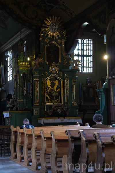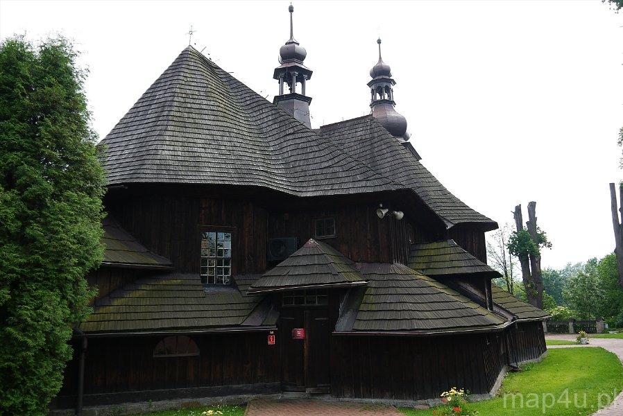 Kościół jest orientowany. Prezbiterium jest mniejsze od nawy i zamknięte wieloboczne, od strony północnej przylega do niego zakrystia, od wschodniej kaplica – Ogrójec z figurą Pana Jezusa Frasobliwego. Nawa ma kształt wydłużonego prostokąta, do którego tuż przy tęczy przylegają kaplice: Matki Bożej Różańcowej oraz św. Franciszka z Asyżu. Znajdująca się od frontu wieża jest konstrukcji słupowej z izbicą, o ścianach pochylonych ku górze. Zwieńczono ją barokowym, baniasty hełmem blaszanym z latarnią i krzyżem. Posiada trzy dzwony: jeden z 1946 r. i dwa z 1965 r. Dach jednokalenicowy, kryty jest stylowym gontem z wieżyczką na sygnaturkę, zwieńczoną hełmem baniastym z latarnią. Kościół otaczają zamknięte soboty.