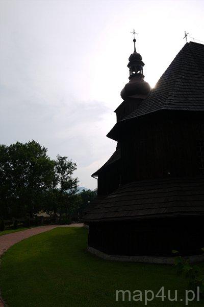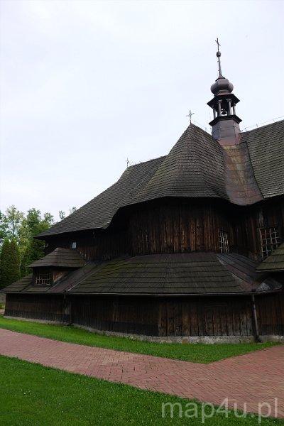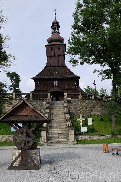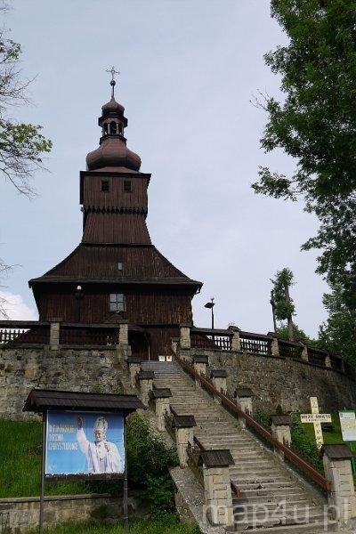 Drewniana świątynia jest jednonawowa, założona na planie krzyża. Zbudowana z bali modrzewiowych, prawie w całości posiada konstrukcję zrębową. Prowadzą do niej strome schody o 130 stopniach wykonane w 1845 r. przez Jana Kanika.