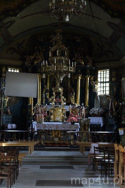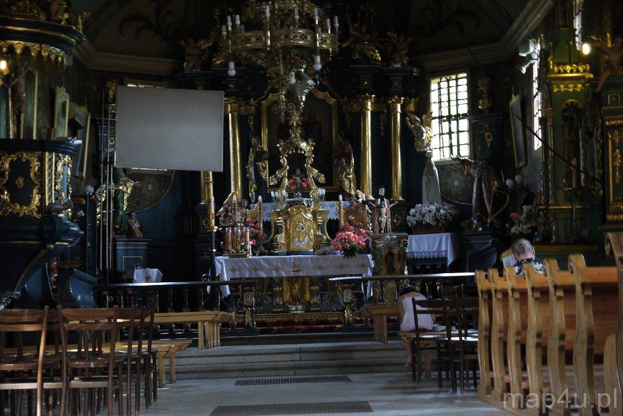 Wnętrze kościoła robi ogromne wrażenie, pełne jest bowiem barokowego przepychu. Występuje tutaj pozorne sklepienie kolebkowe. Łącznie w kościele jest osiem ołtarzy i cztery konfesjonały (dwa barokowe z XVIII w.). Ołtarz główny reprezentuje styl rokokowy, a boczne barokowy i neogotycki. Na uwagę zasługują również: barokowa ambona, ławki z 1848 r., dwie kamienne kropielnice w stylu barokowym, stacje Drogi Krzyżowej z 1840 r. i niektóre obrazy wykonane przez żywieckiego malarza Antoniego Chrząstkiewicza. Cenny jest także chór muzyczny, wsparty na dwóch kolumnach, w którym znajdują się zbudowane przez firmę Rieger organy z 1890 r. Zdobiąca wnętrze świątyni polichromia, autorstwa Adama Giebułtowskiego, wykonana została w 1929 r.